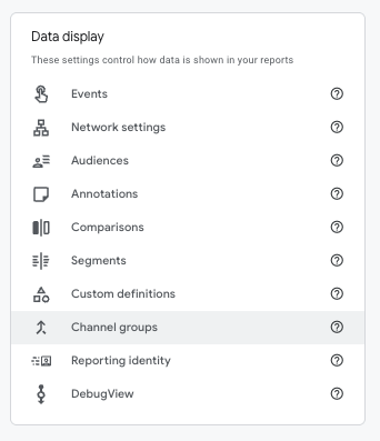 Inside your GA4 property, head to Admin → Data Display → Channel Groups.